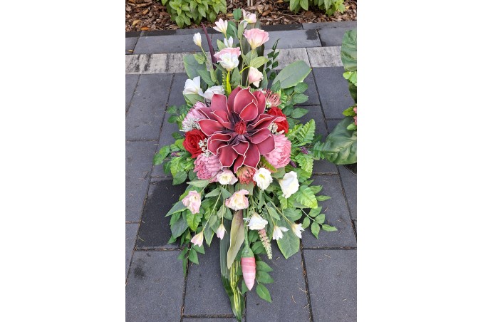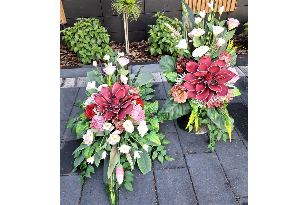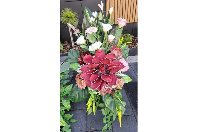 Bukiet w pojemniku z tworzywa utrwalony masą dzięki temu jest ciężki, stabilny i nie podatny na wiatr.