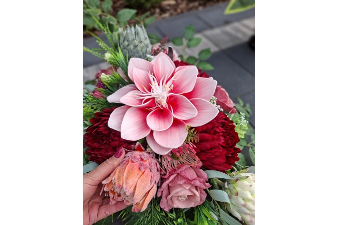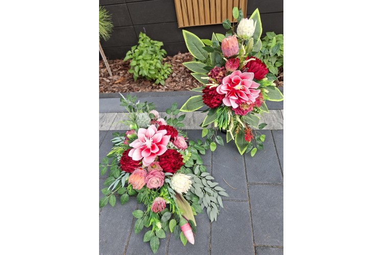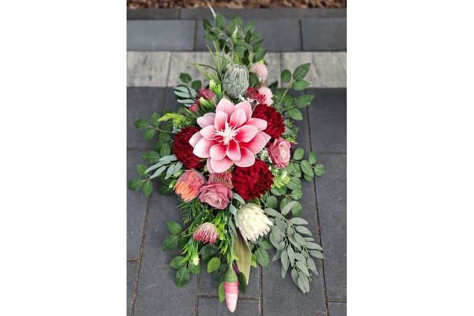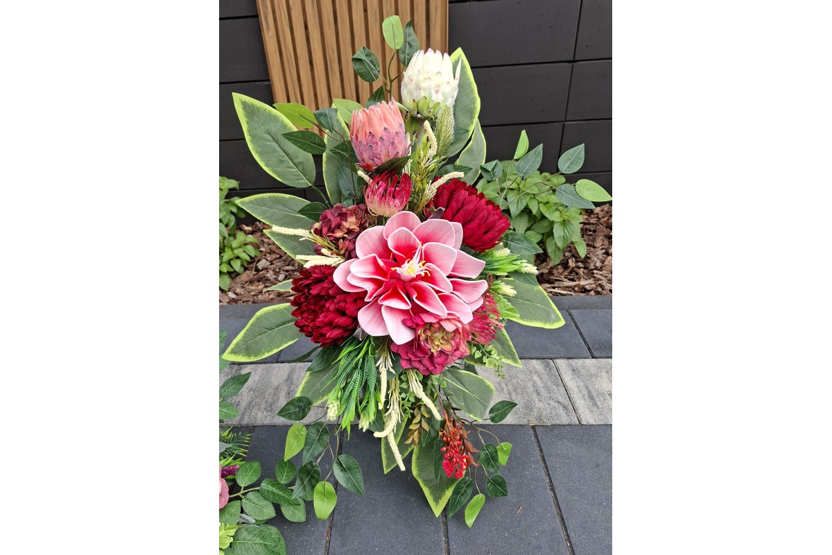 Bukiet w pojemniku z tworzywa utrwalony masą dzięki temu jest ciężki, stabilny i nie podatny na wiatr.