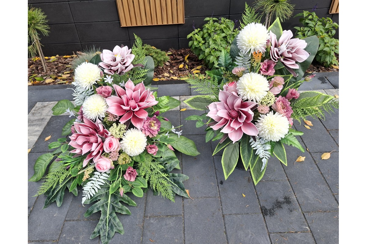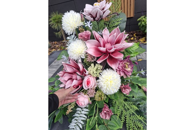 Bukiet w pojemniku z tworzywa utrwalony masą dzięki temu jest ciężki, stabilny i nie podatny na wiatr.