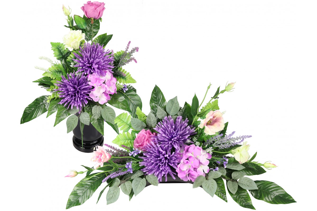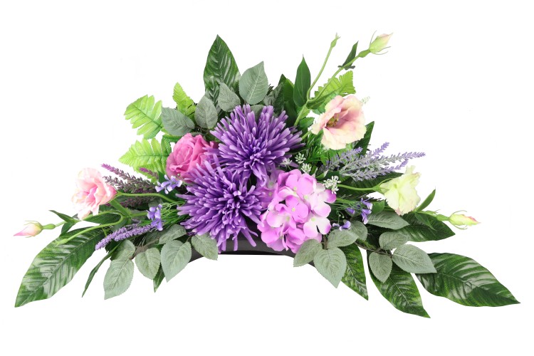 Bukiet w pojemniku z tworzywa utrwalony masą dzięki temu jest ciężki, stabilny i nie podatny na wiatr.