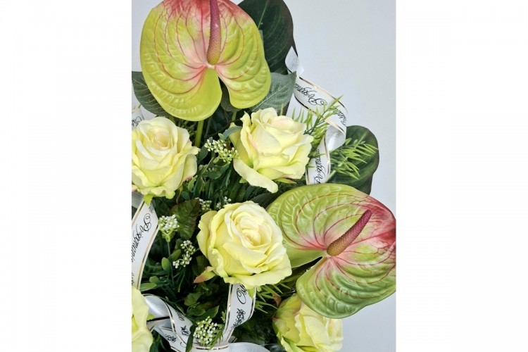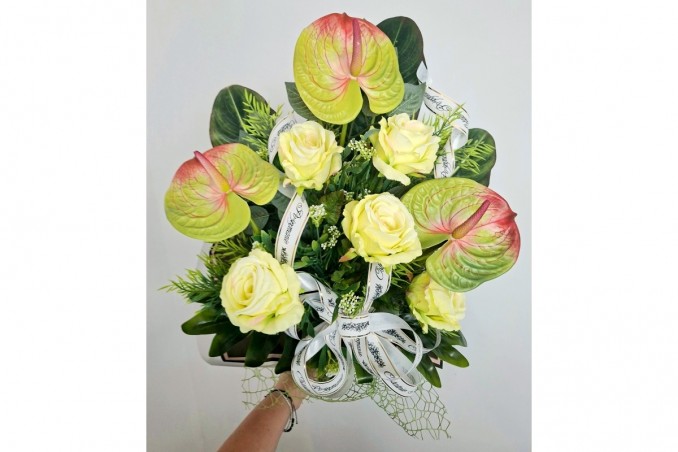 Bukiet pogrzebowy z gumowanego anturium i róż na łodydze 8 szt