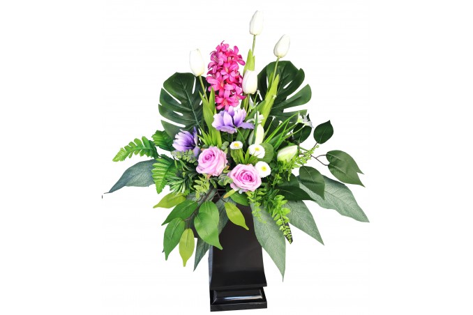 Bukiet w pojemniku z tworzywa utrwalony masą dzięki temu jest ciężki, stabilny i nie podatny na wiatr.