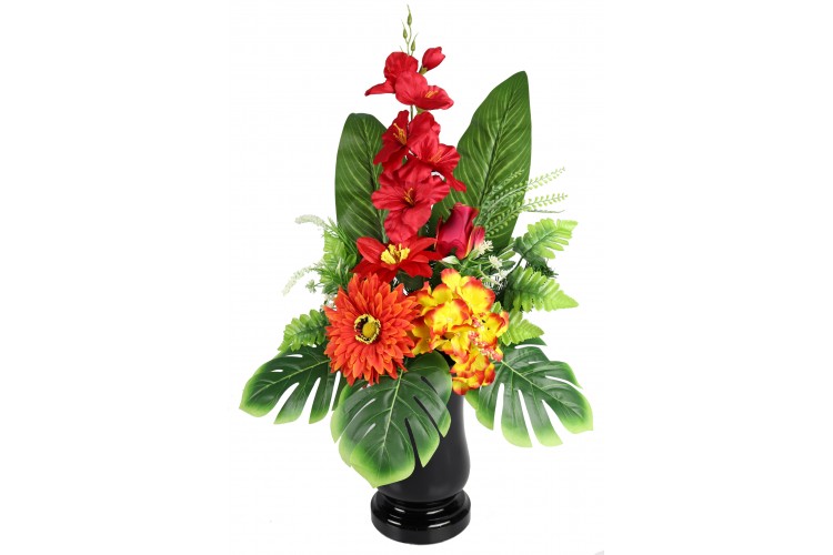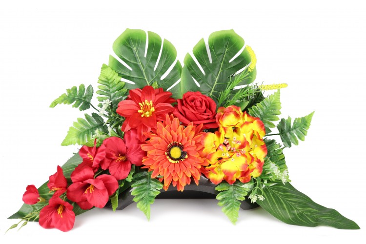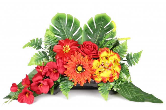 Bukiet w pojemniku z tworzywa utrwalony masą dzięki temu jest ciężki, stabilny i nie podatny na wiatr.