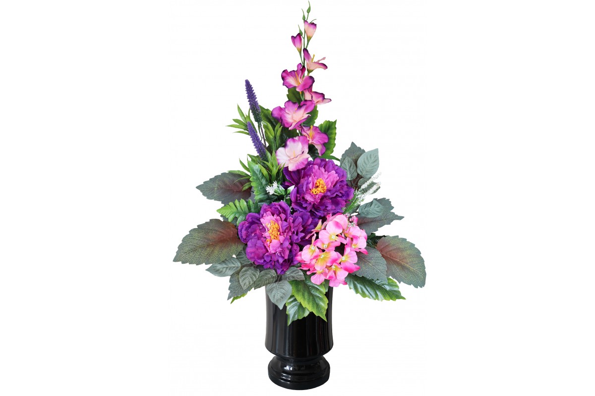 Bukiet w pojemniku z tworzywa utrwalony masą dzięki temu jest ciężki, stabilny i nie podatny na wiatr.