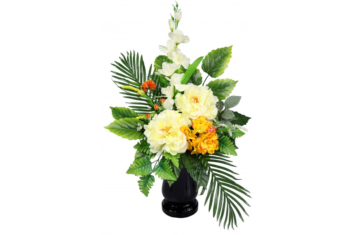 Bukiet w pojemniku z tworzywa utrwalony masą dzięki temu jest ciężki, stabilny i nie podatny na wiatr.