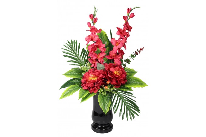 Bukiet w pojemniku z tworzywa utrwalony masą dzięki temu jest ciężki, stabilny i nie podatny na wiatr.